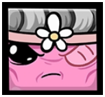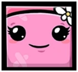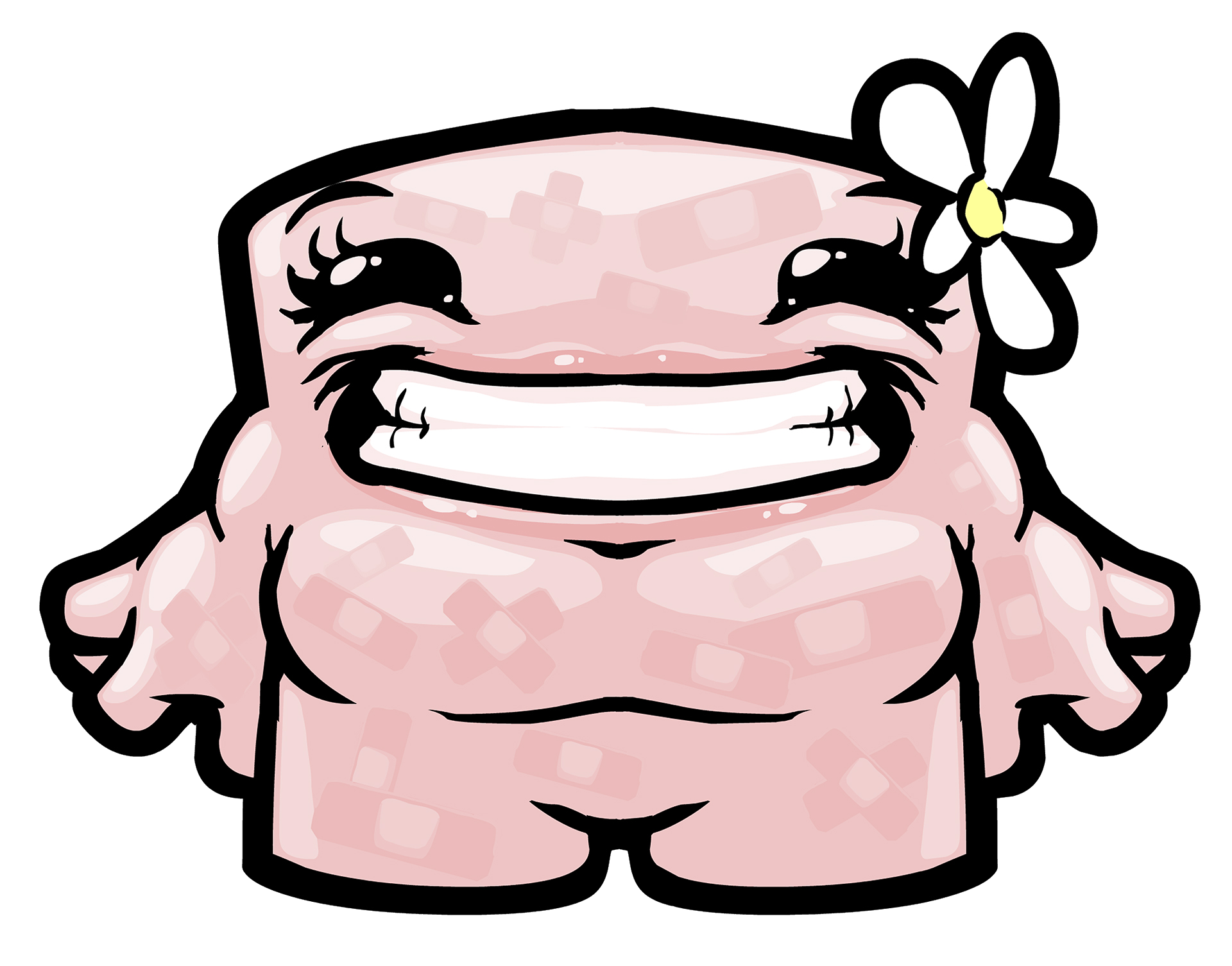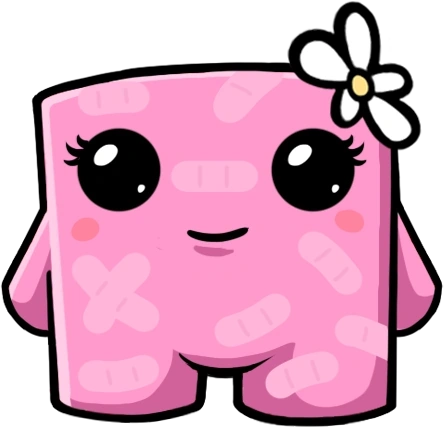 Bandage Girl appears to be composed mostly, if not entirely, of pink adhesive bandages, taking up a cube-like shape with stubby arms and legs. Her hands have four fingers each. She has eyelashes, and usually wears a flower with white petals on her head, likely a daisy. This flower was given to her by Meat Boy when they first met. She is slightly smaller than Meat Boy.