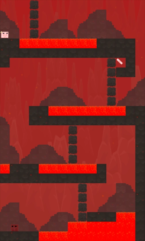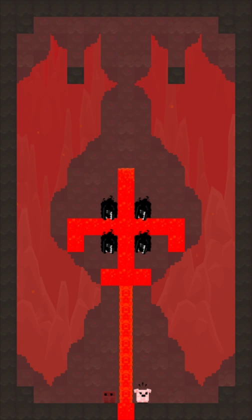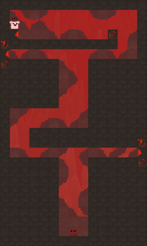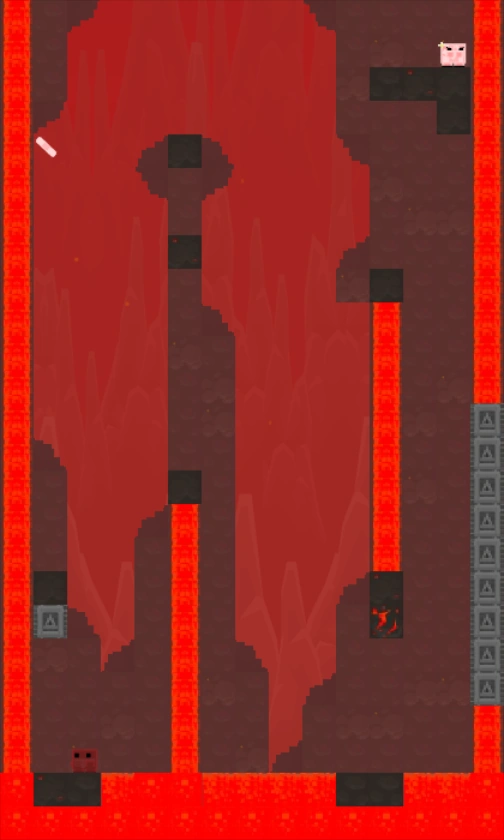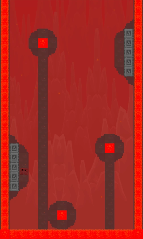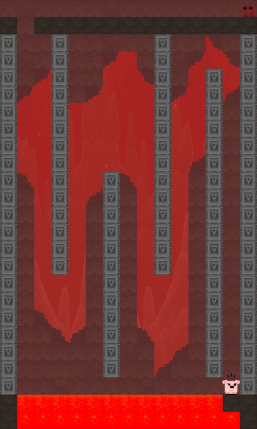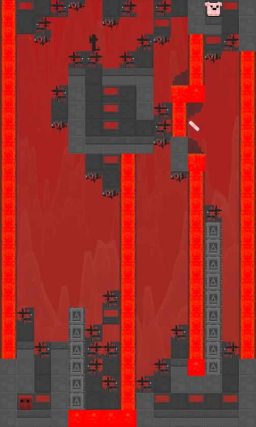 Hell is noticeably more difficult and complex than the previous worlds; its levels tend to be fairly cramped, with lava and sawblades everywhere (especially in the Dark World). Other hazards include spikes (although less frequently than in other chapters), lava and buttholes strange openings that constantly spit out balls of magma that can roll and bounce around the level. New enemies include Laser Eyes which swivel towards Meat Boy, and Black Maws which appear out of portals and explode into nine miniature versions when they touch walls. Hell also introduces portals which transport Meat Boy between them.